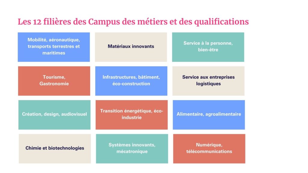 Portés conjointement par l’Éducation nationale et les régions, labellisés par l’État, les Campus des Métiers et des Qualifications (CMQ) constituent une forme inédite de de fédérations d’acteurs (entreprises, CFA, universités, associations…) autour d’une filière professionnelle.